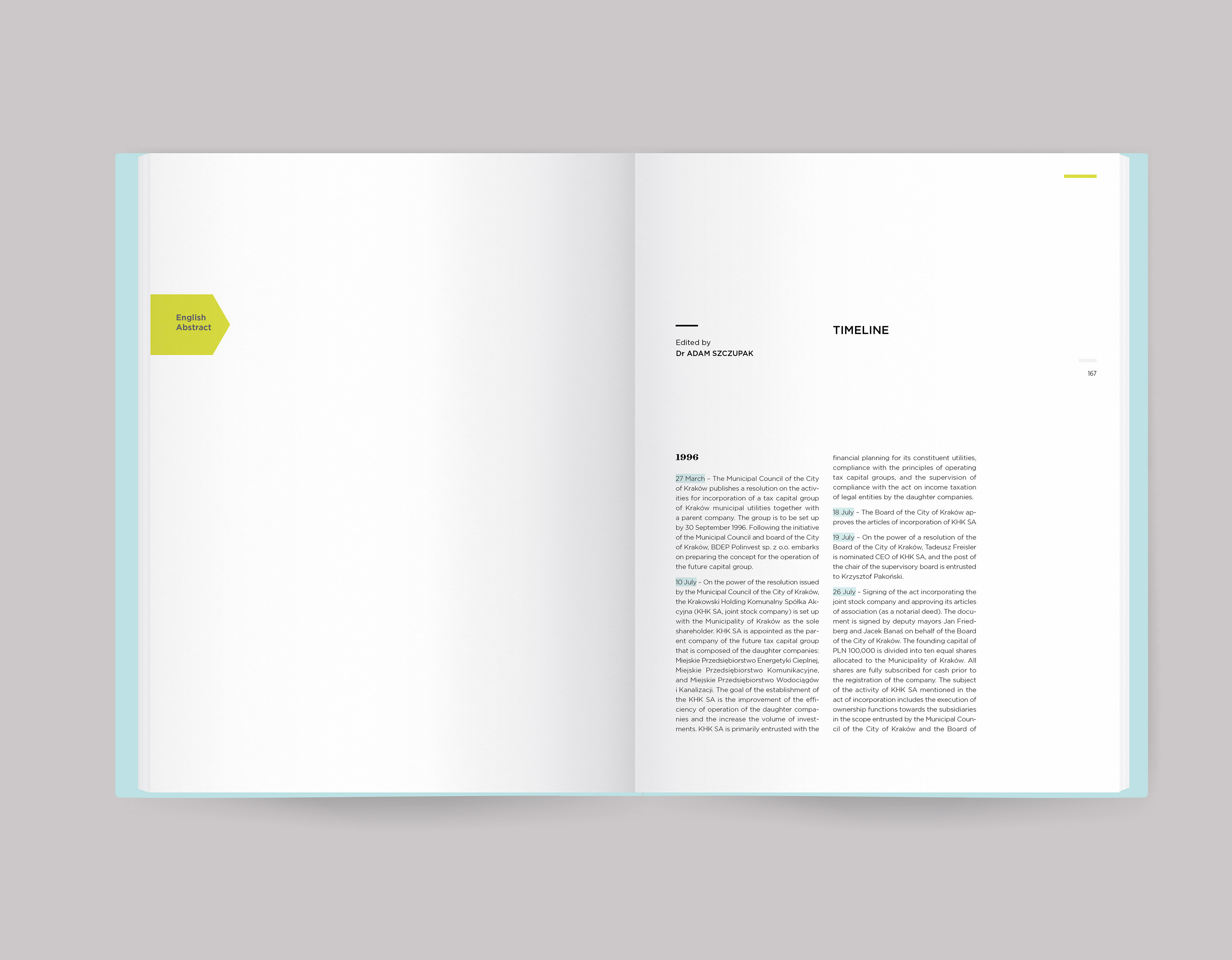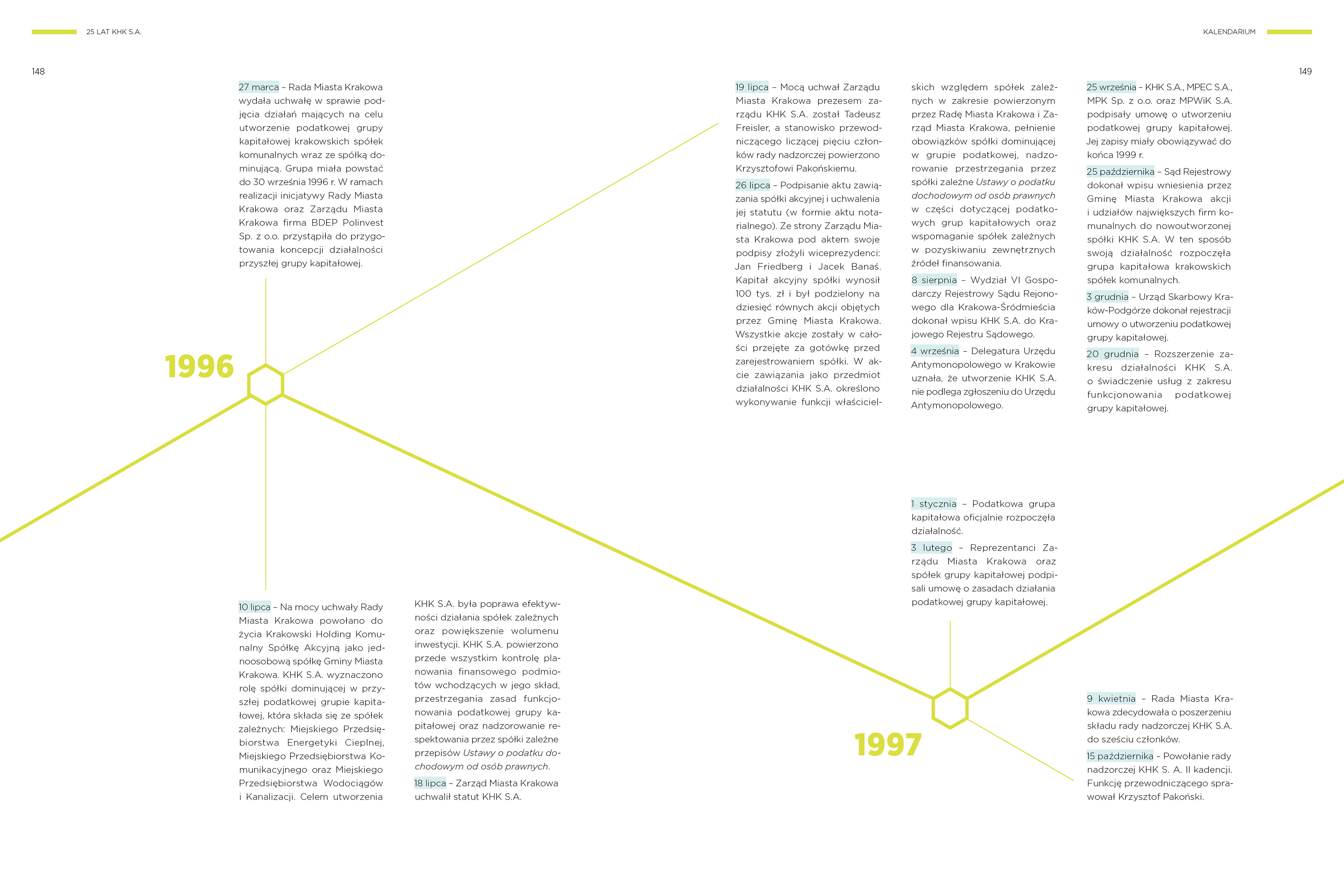 This publication is a particular chronicle of the events that have taken place over the 25 years of operation of Krakowski Holding Komunalny (a municipal holding company) – KHK SA (a tax-equity group comprising Krakow-based companies providing services related to the municipal utilities sector)
